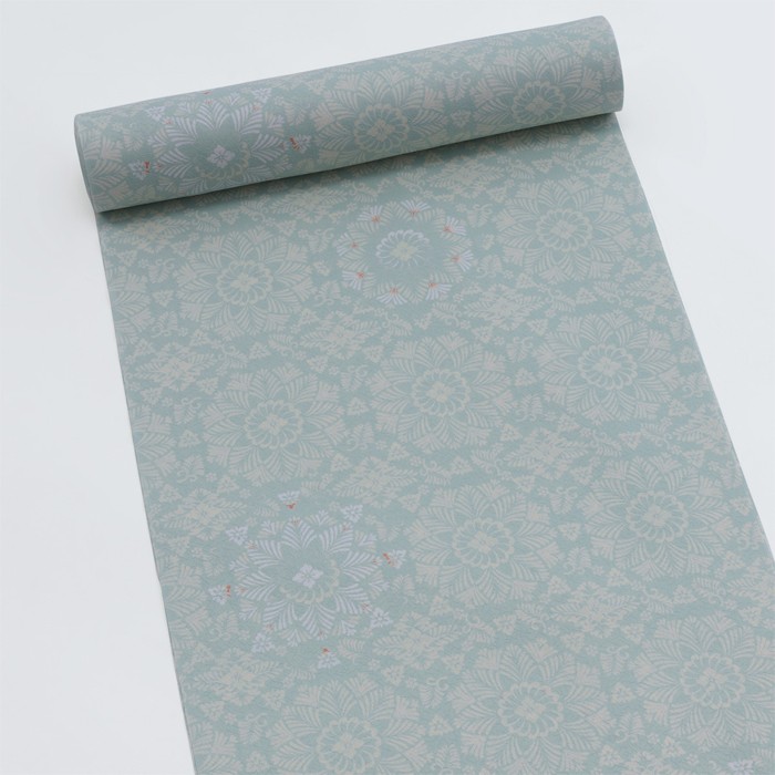 透明感のあるミントグリーン地に細やな文様を馴染むように配色した、お茶席にふさわしい総柄の小紋です。