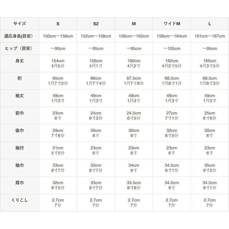| 身丈 | 154cm 4尺5分 | 156cm 4尺1寸 | 160cm 4尺2寸 | 162cm 4尺2寸5分 | 165cm 4尺3寸5分 |