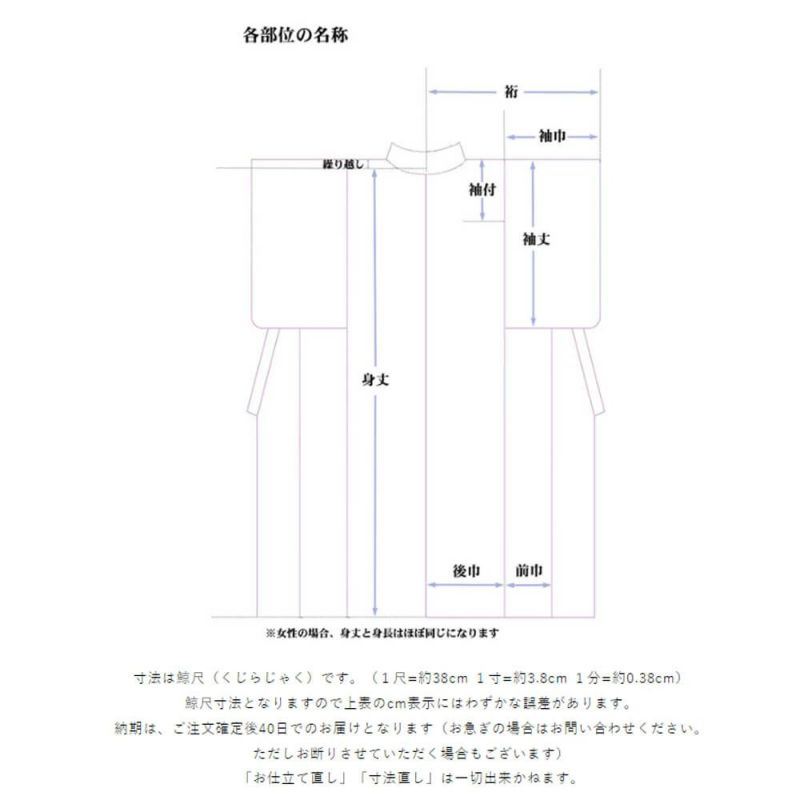| 裄 | 65cm 1尺7寸2分 | 66cm 1尺7寸4分 | 67.5cm 1尺7寸8分 | 68.5cm 1尺8寸1分 | 69.5cm 1尺8寸3分 |