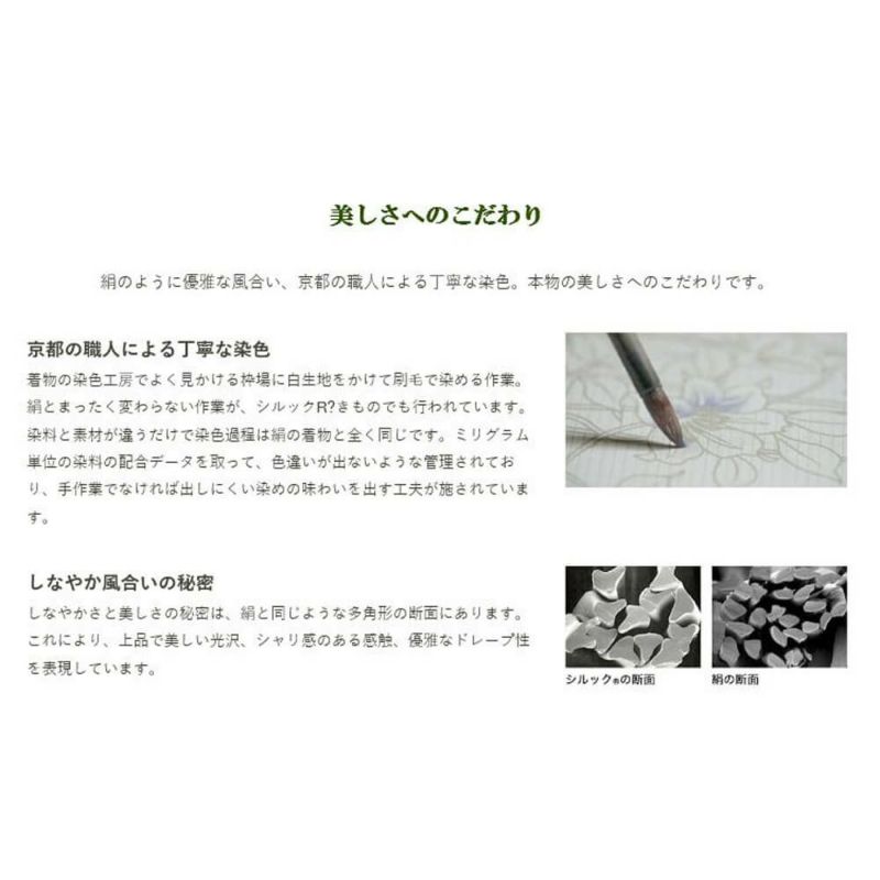 絹のように優雅な風合い、京都の職人による丁寧な染色。本物の美しさへのこだわりです。