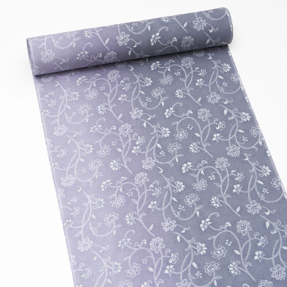 繁栄や長寿を表す吉祥文様である唐草を全面にあしらい、シックな配色でたてぼかしに染めました。