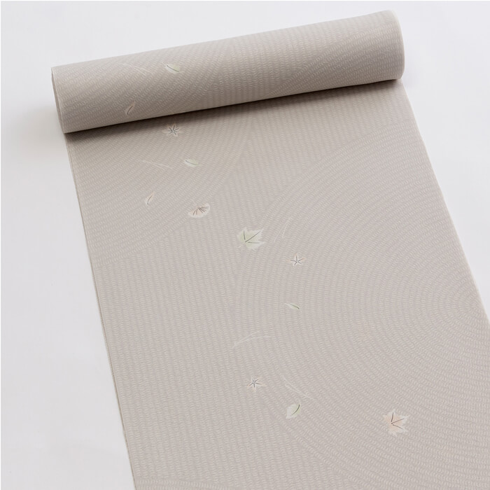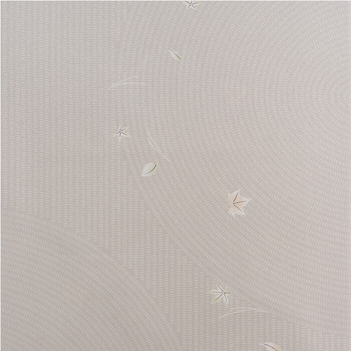 枯山水の庭園をイメージした地模様に、風によって吹き集められた木の葉を可憐にあしらいました。紅葉、松葉、銀杏のほか、身近な街路樹の葉であるスズカケなどの広葉樹を散らしています。