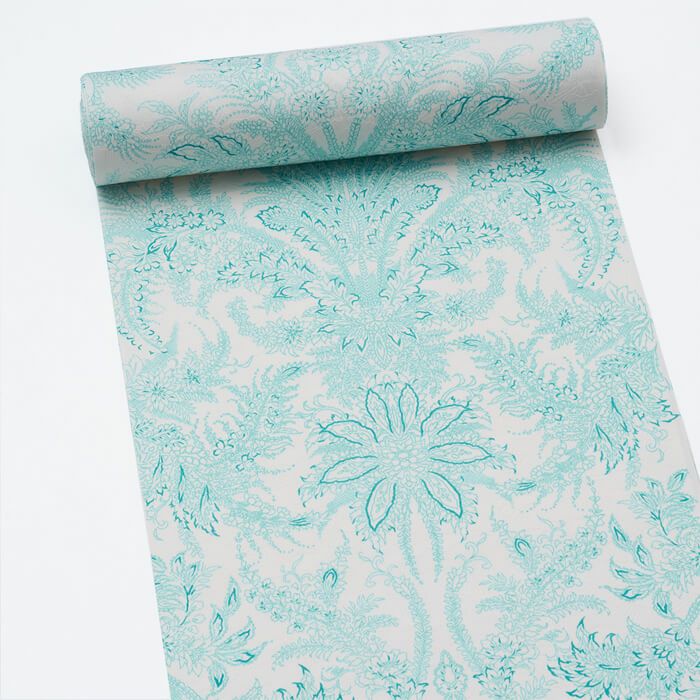 繊細でエキゾチックなモチーフを、清涼感のある鮮やかな配色でまとめた小紋は、