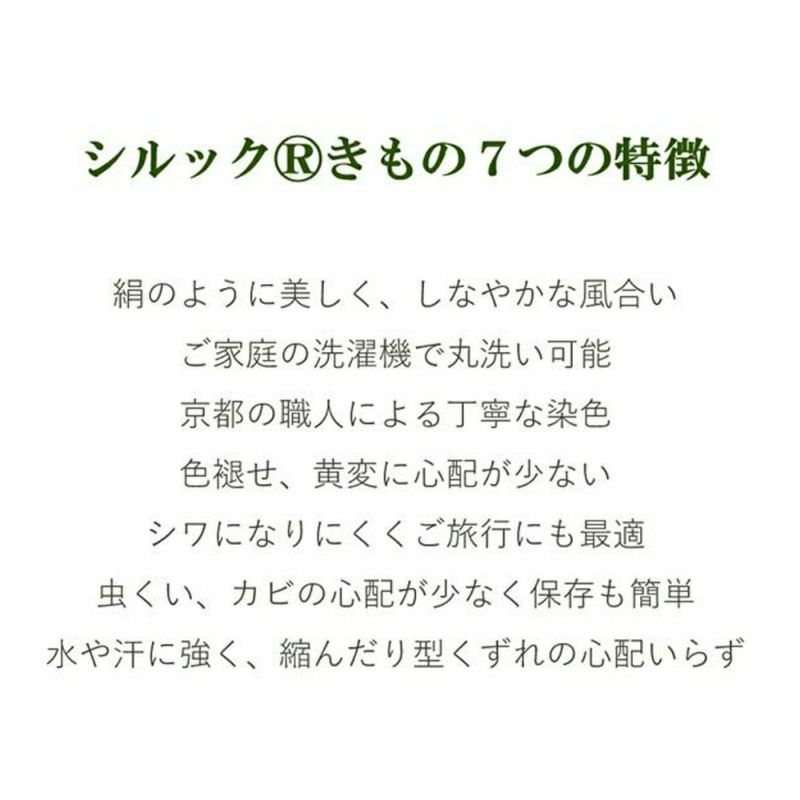 気軽に洗えるのが魅力なシルック®きもの。ポリエステル100%なのでご家庭で気軽にお洗濯できますので、いつも清潔な状態でお召いただけます。