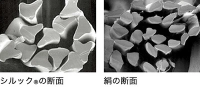 しなやかさと美しさの秘密は、絹と同じような多角形の断面にあります。これにより、上品で美しい光沢、シャリ感のある感触、優雅なドレープ性を表現しています。