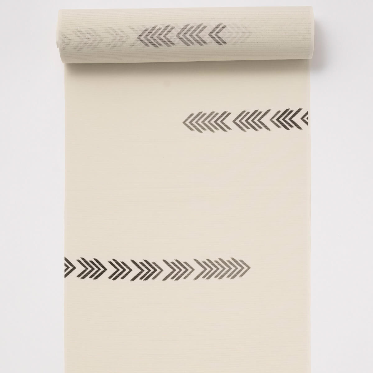 筆でラフに描いたような矢羽根は互い違いに飛び、さらにグラデーションで表現することでより軽やかな表情に。柄の存在感はありながも、帯合わせのしやすい小紋です。