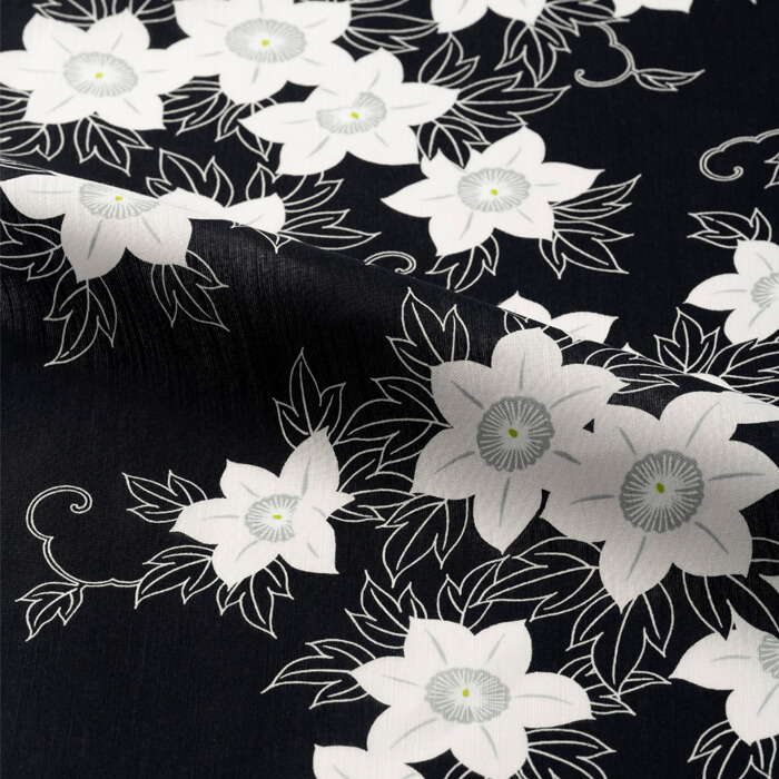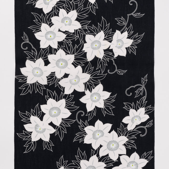 こぼれ落ちそうに咲く鉄線のゆかた。 シャープに描かれた線描きの葉と柔らかく流れるような配置のコントラストが濃色の地色によく映えます。 瑠璃色はかわいいイメージ、深緑と鉄紺は大人っぽい印象ですが、ぬけるような花の白が遠目に見ても華のある着姿です。 |