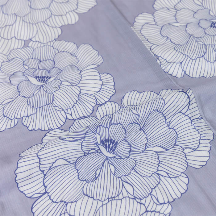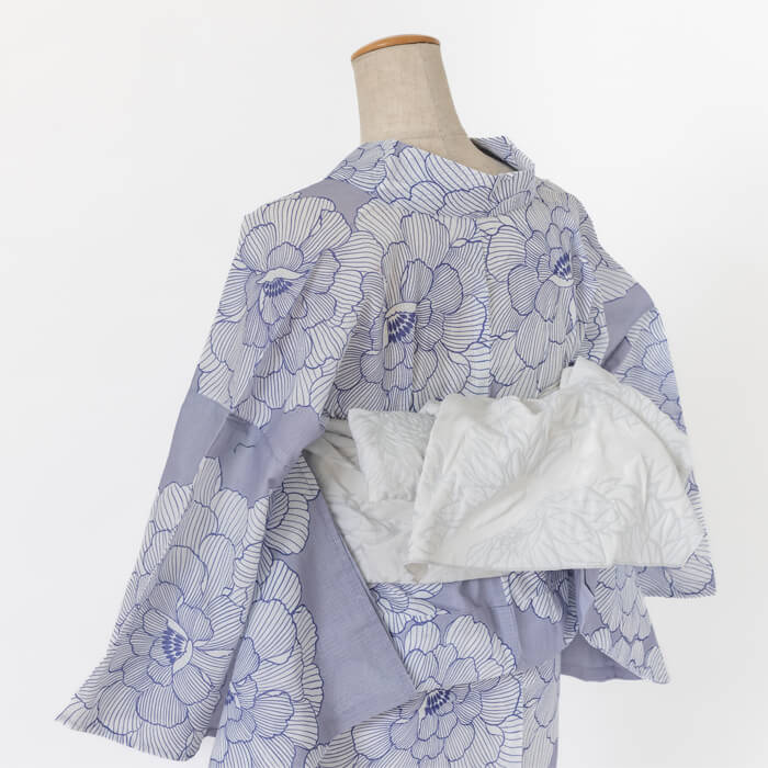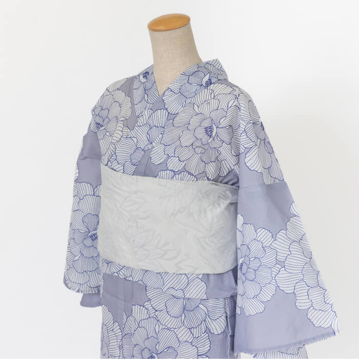 フジブルー地に牡丹の白の牡丹が女性らしい印象の浴衣です。