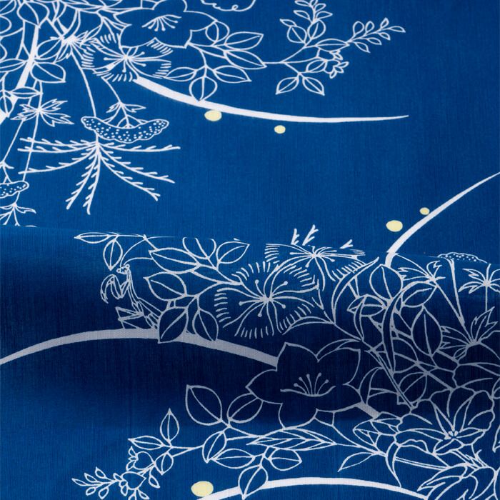 生地は「綿清水生地」を使用。清らかな川の流れを縦糸のスラブ糸で表現した生地で番手の異なる縦糸を使用し、染めたときに現れる自然な濃淡は清涼感を与えてくれます。