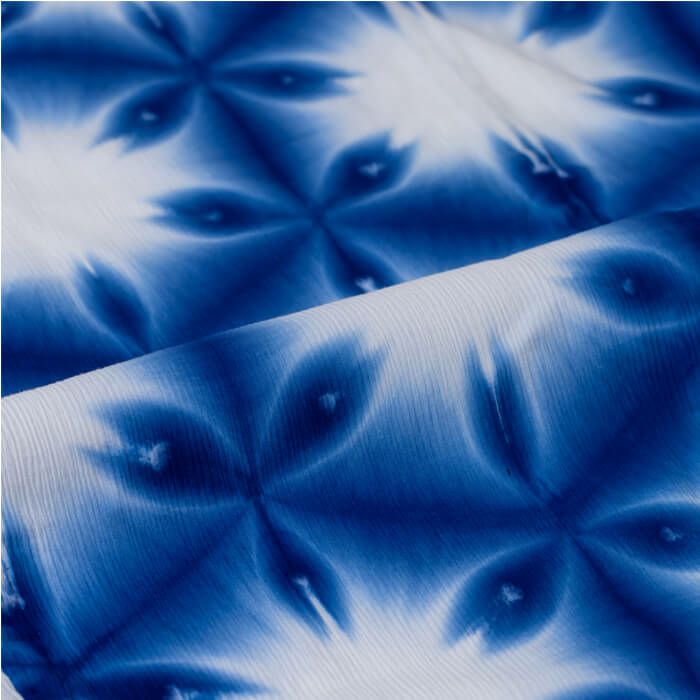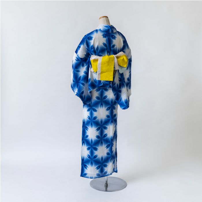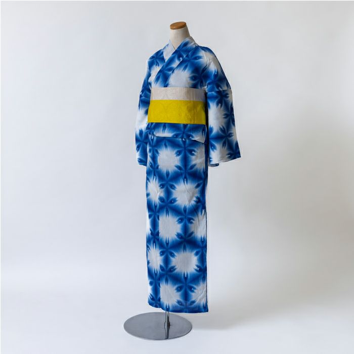 滲みによる色の濃淡が美しく、雪の結晶の様な柄で涼を誘う雪花絞りの浴衣です 紺色は普遍的な美しさです |