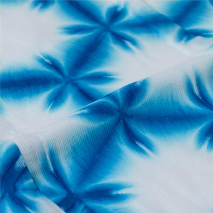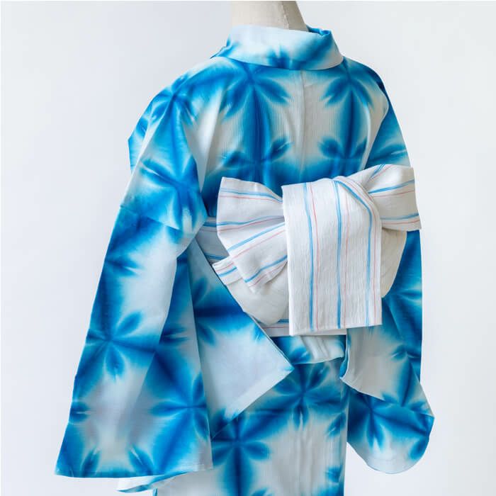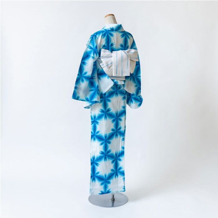 滲みによる色の濃淡が美しく、雪の結晶の様な柄で涼を誘う雪花絞りの浴衣です ターコイズブルーが爽やかな浴衣です |