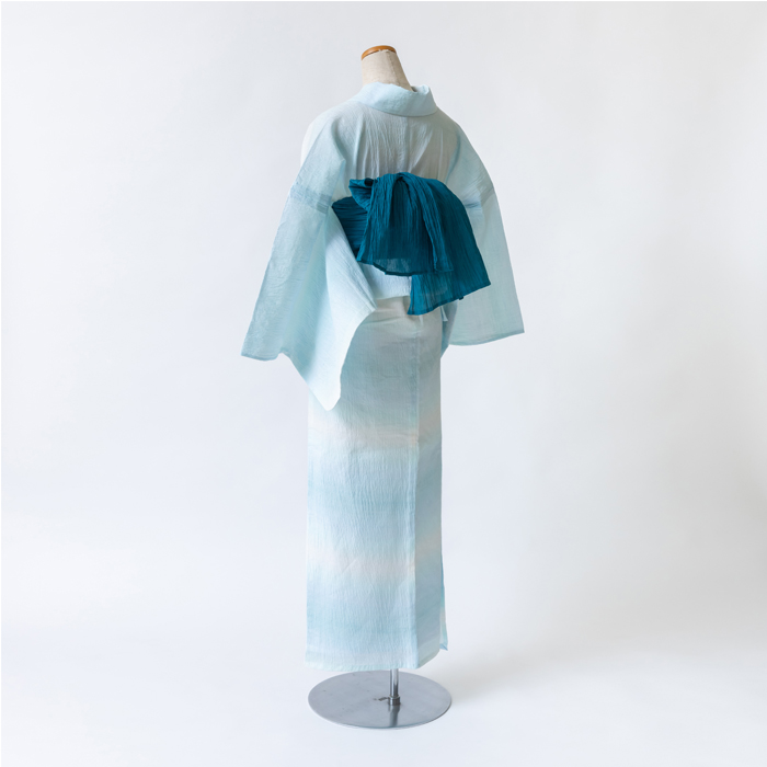 水色とターコイズの優しいグラデーションの先染めゆかた 帯合わせにより、夏着物風の着こなしもよく似合います |