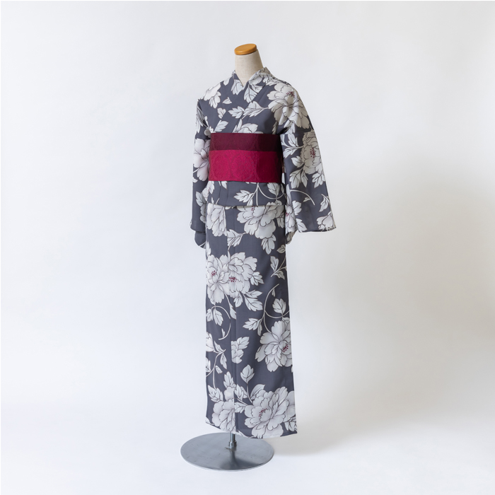 大きめの牡丹が目を引く華やかな浴衣です シックな色合いですので派手になりすぎず、上品に着こなして頂けます |