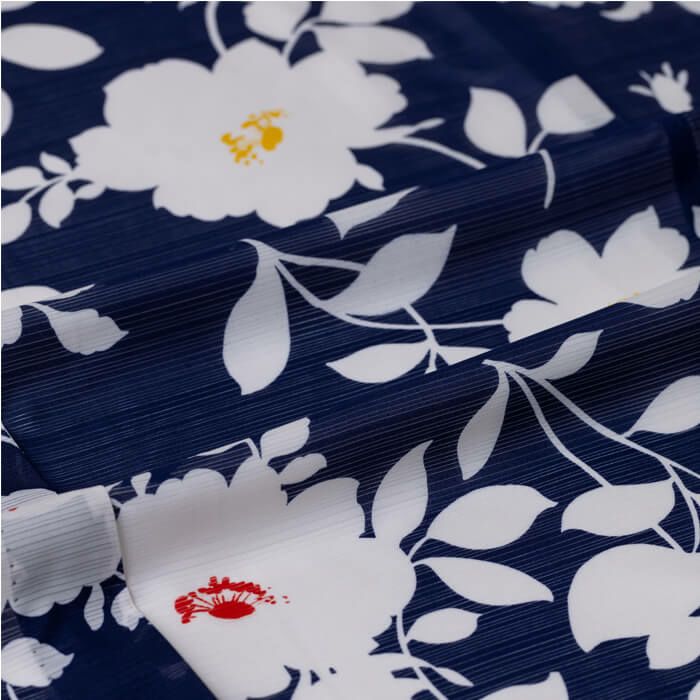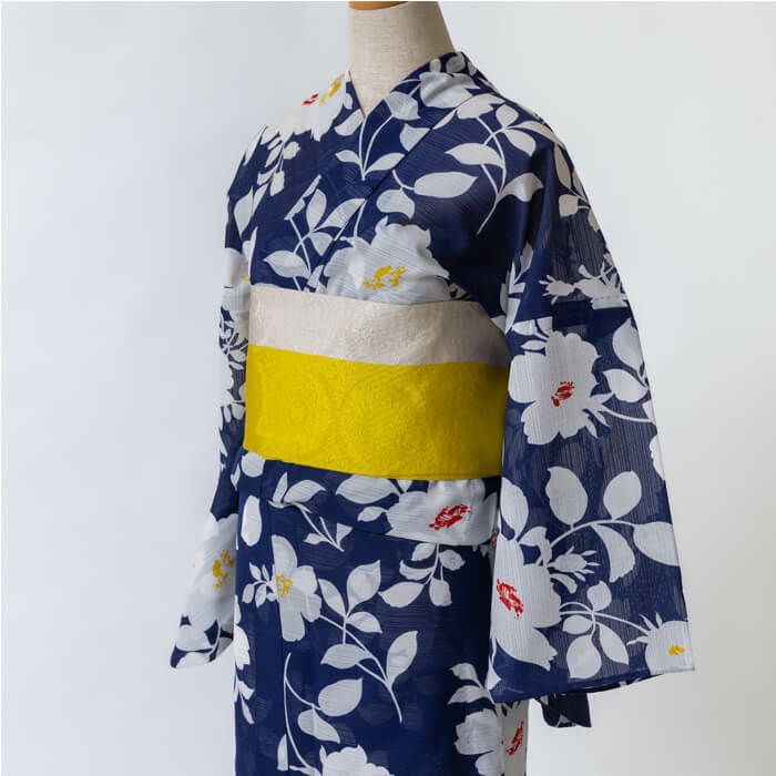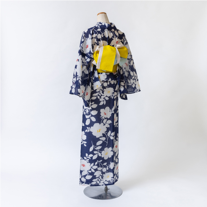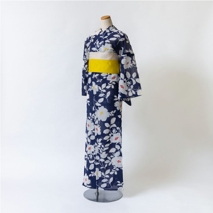 草花をシルエットで表現した軽やかなデザインの浴衣です 普遍的な紺色×白は飽きの来ない組み合わせで、帯合わせによって印象が変わります |