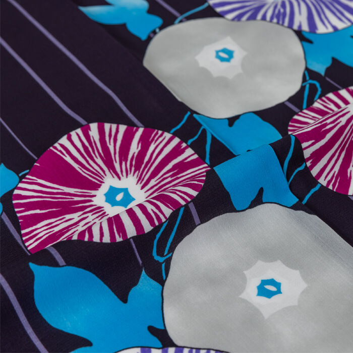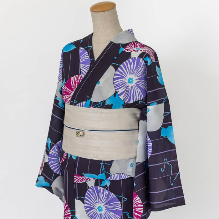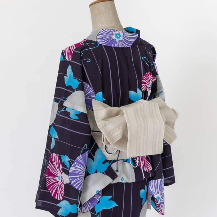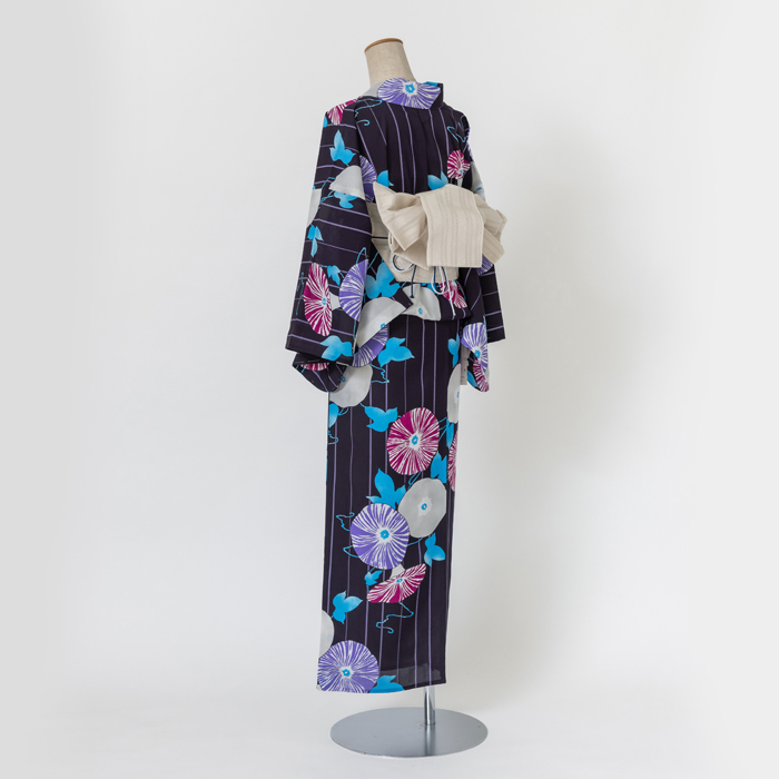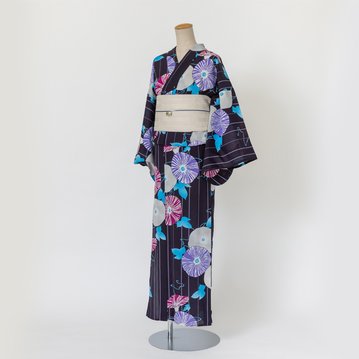 濃い紫色に艶やかな朝顔の花が咲く夏らしい浴衣、