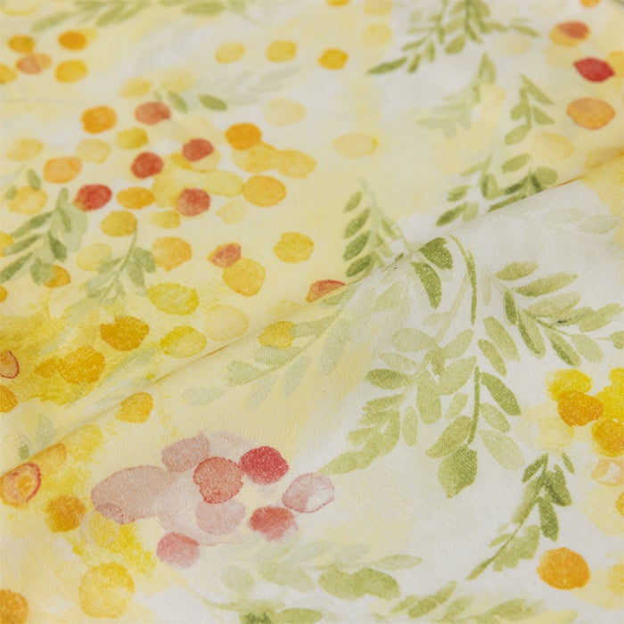 やわらかなクリーム地に、可憐なミモザがふんわりと咲き広がる華やかな一枚
