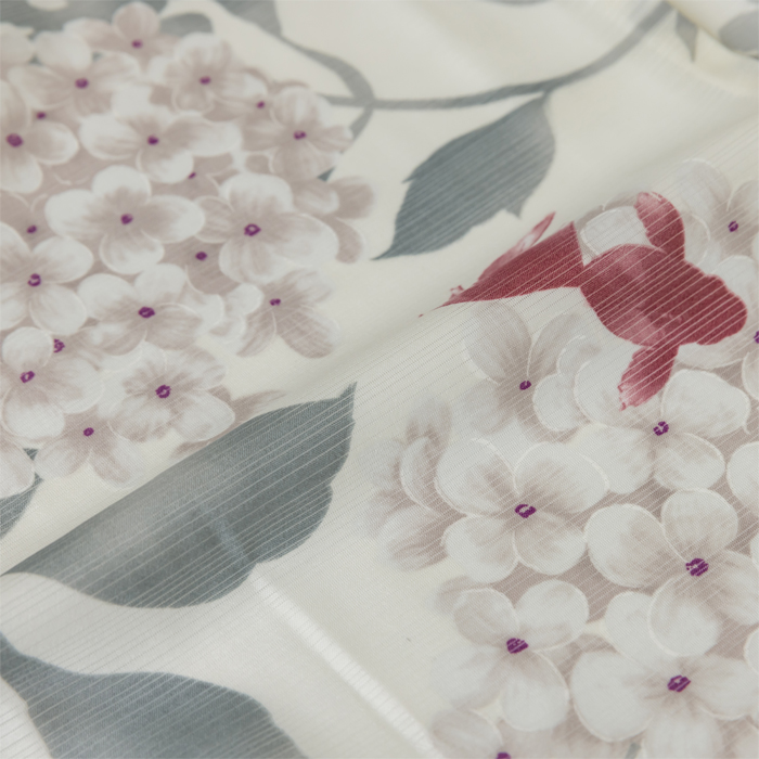 柔らかな生成り色の地に、淡く繊細な紫陽花(あじさい)と、