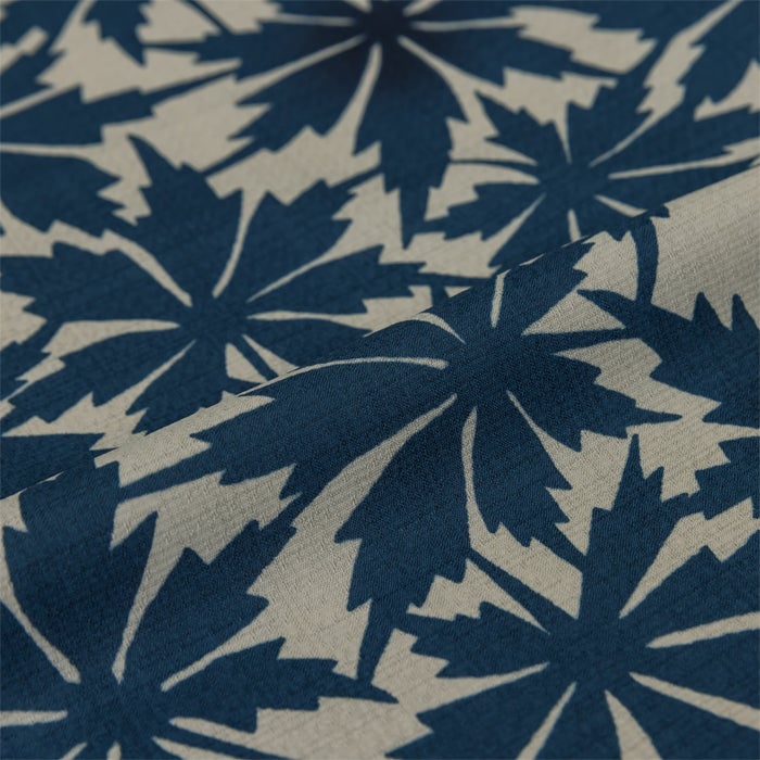 落ち着いた生成り地に重なる幾何学的な葉のシルエットが、