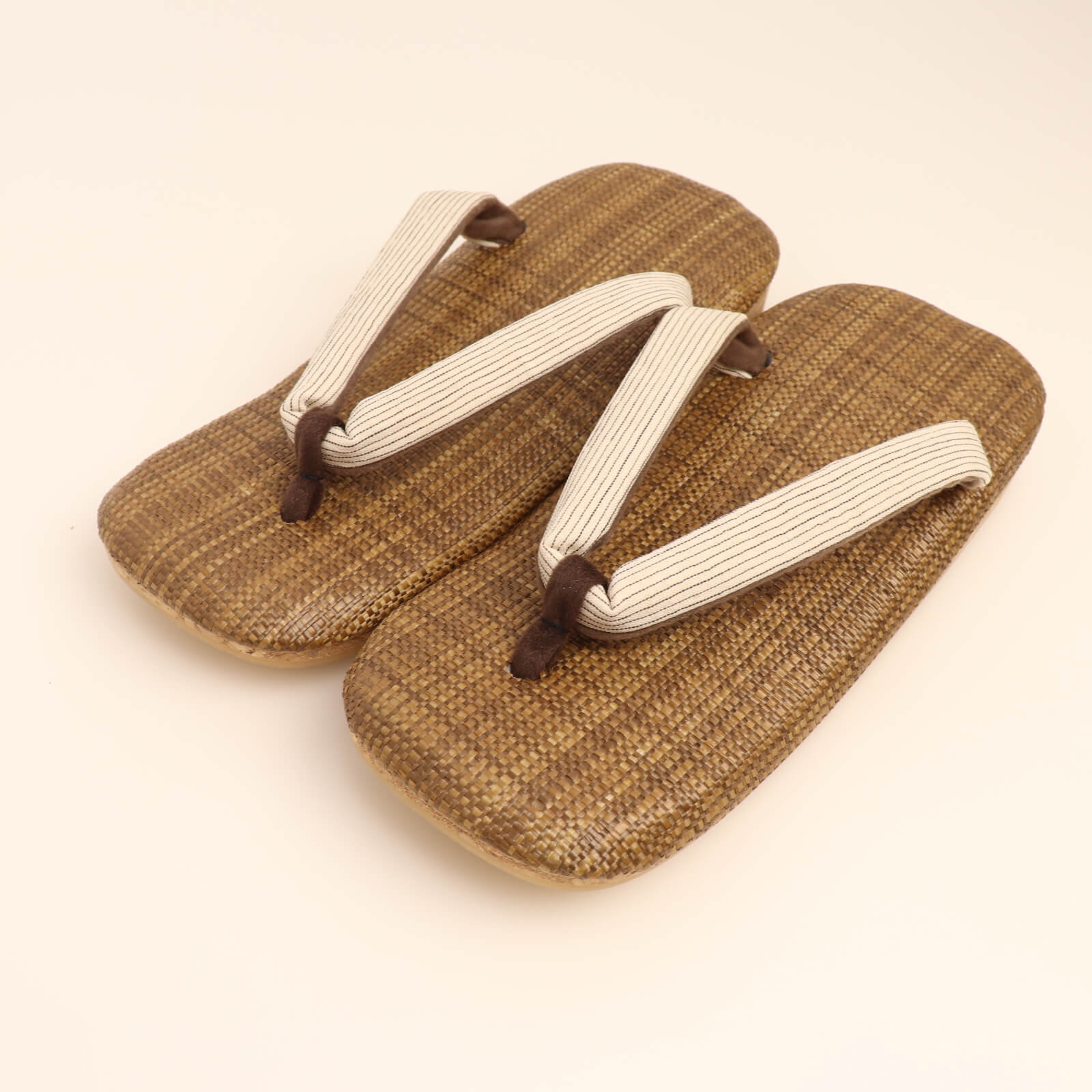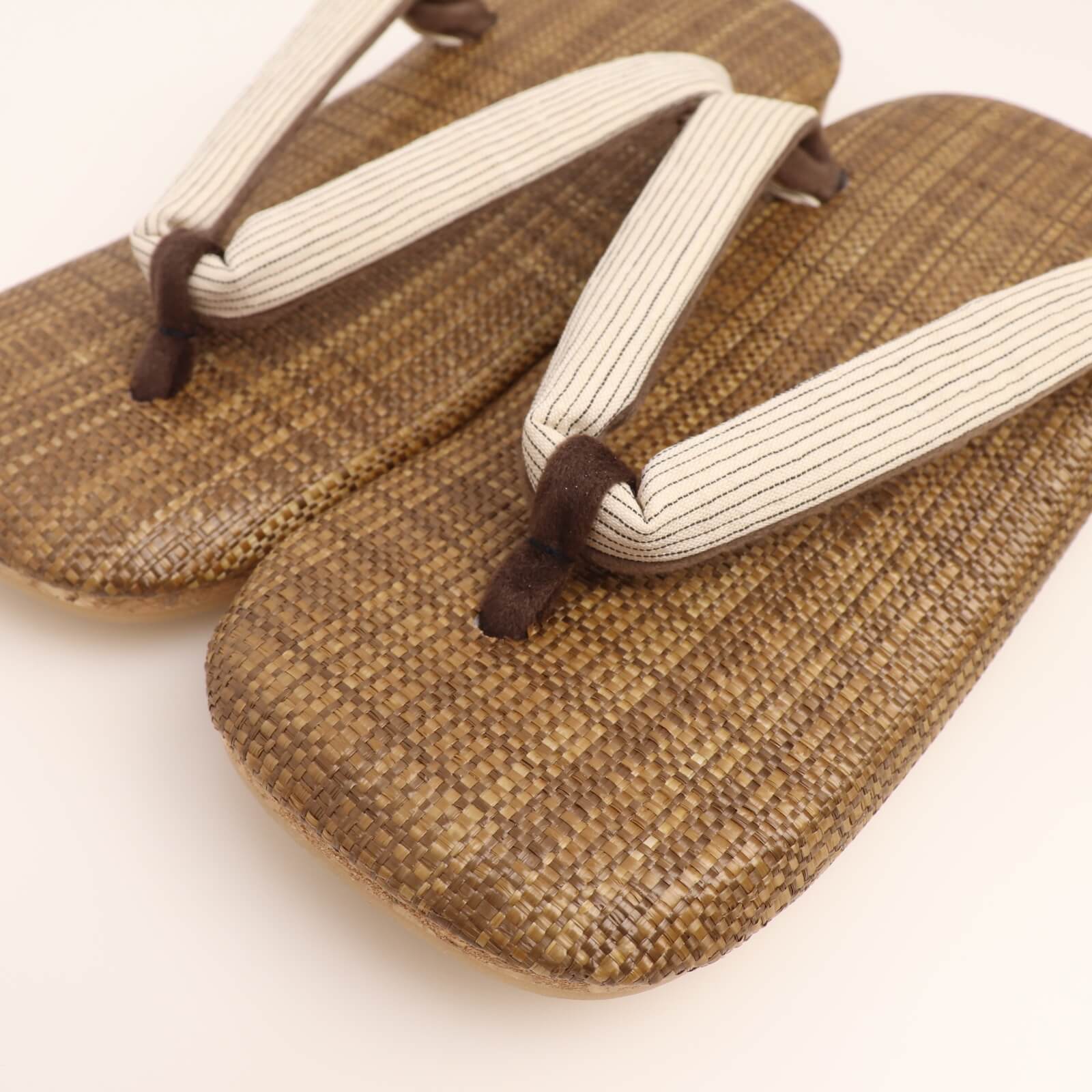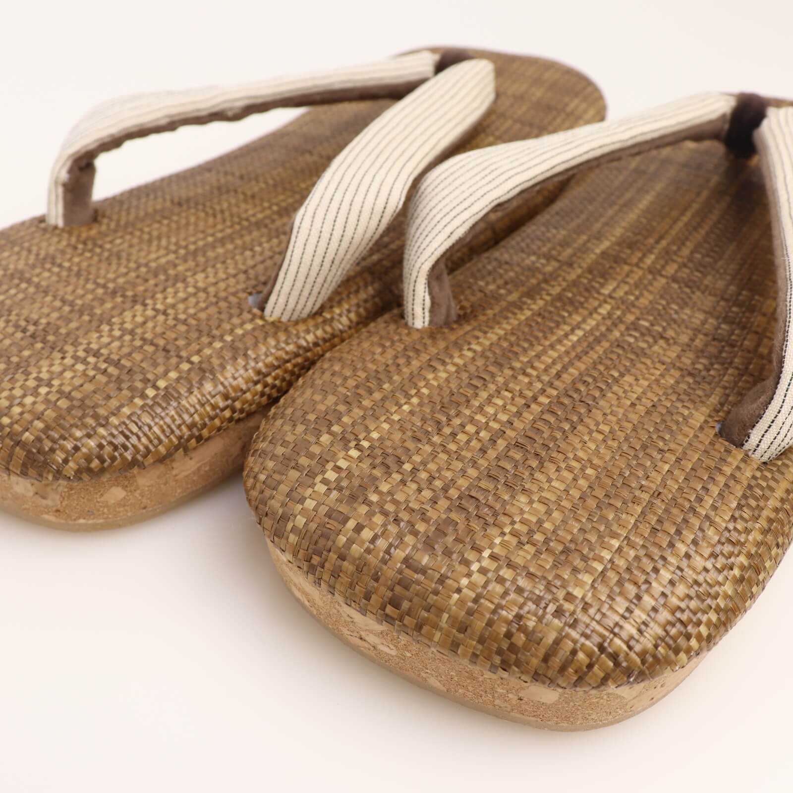 【MEN'S古今】本麻鼻緒のカジュアル雪駄 男物雪駄 No.233 ベージュ×茶台 小千谷縮み 本麻鼻緒 カジュアル草履 Мサイズ 25.0cm