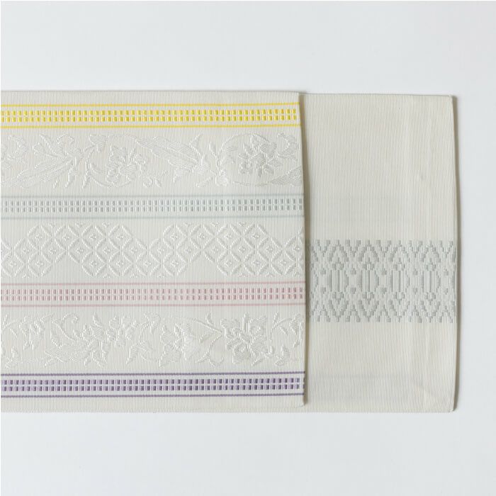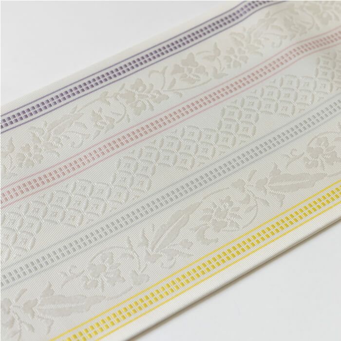 直線と曲線が織りなす優美なデザインを絶妙な配色で織り上げた半幅帯です