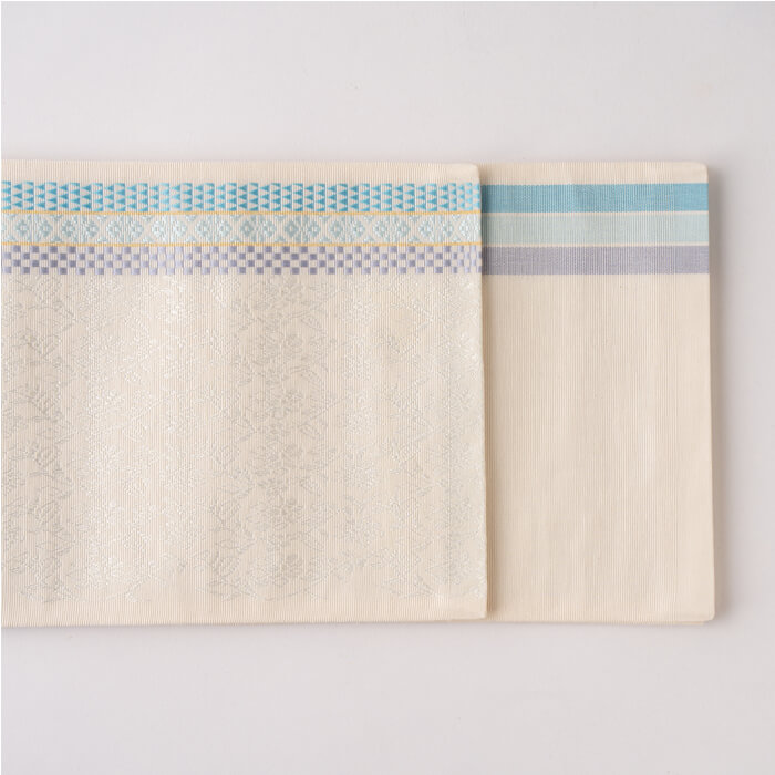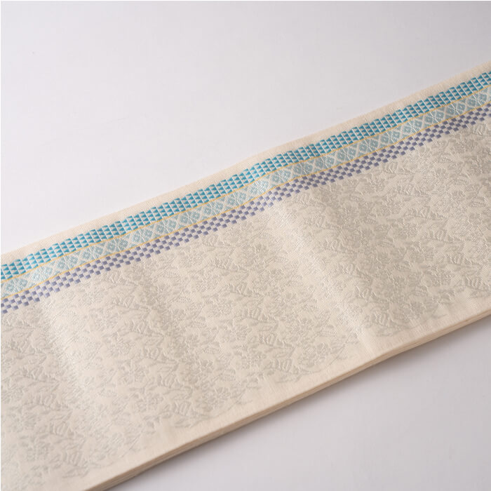 帯幅が4寸3分と少し広めに織っており、着物風の着こなしにもよく合います
