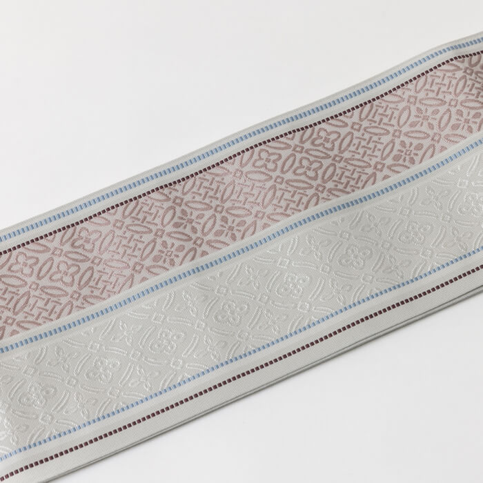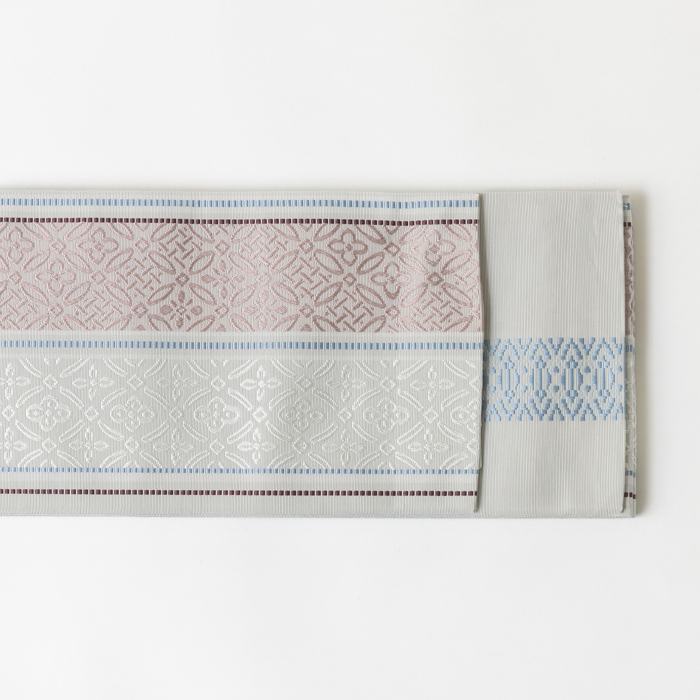 直線と曲線が織りなす優美なデザインを絶妙な配色で織り上げた半幅帯です。