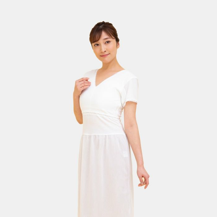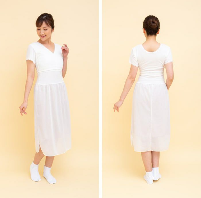 また、不快なまとわりつきを防ぐことが大事な裾除。それにあたるスリップのスカート部分はベンベルグ混の生地を使用。旭化成さんの<ベンベルグ>の特徴は、繊維の断面が真円に近く表面もなめらか、滑るような肌触りでデリケートな肌も傷つけにくい。また、吸放湿性にも優れていて、繊維の中に水分を多く含むベンベルグを使用したこの生地は、ポリエステル100%のようなパサつきがほとんどなく、しっとりとした肌触りが特徴です。