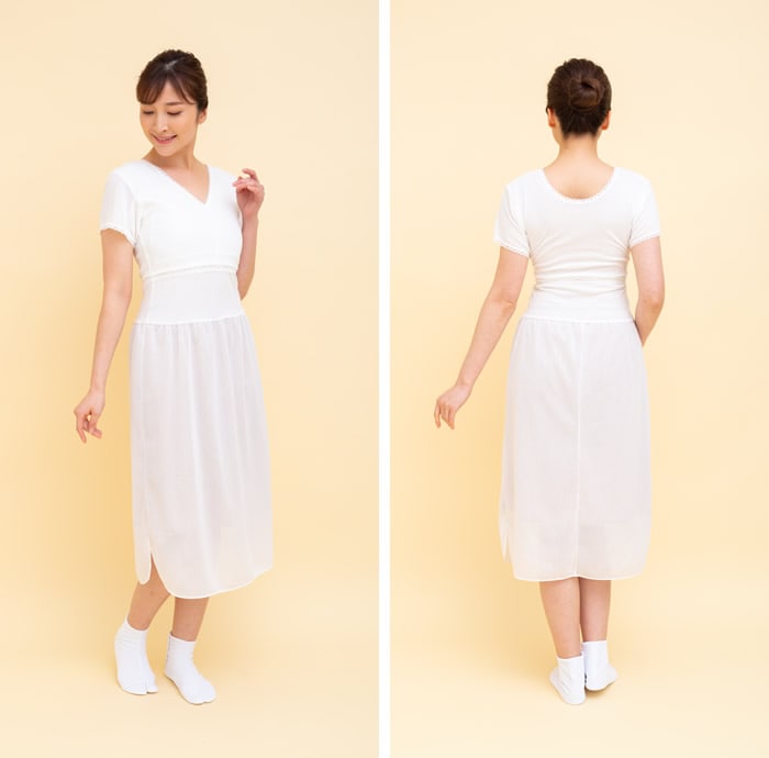 形はスポッとかぶるだけのシンプルなワンピースタイプ。無駄な生地が余らずシルエットもきれい。紐で結ばないので締め付けも、結び目が着物に響く心配もありません。