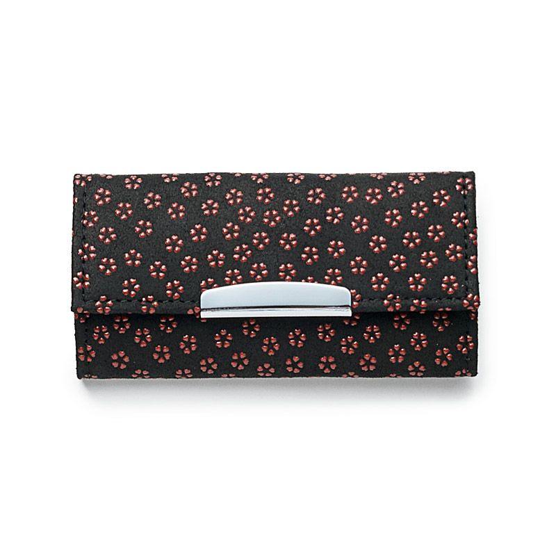 フック4つが付いた、一般的なサイズのキーケースです。黒の鹿革地に濃い赤漆が、柄を引き立たせ印象的です。上品で大人っぽい雰囲気ながら、小桜柄の素朴な愛らしさもあります。