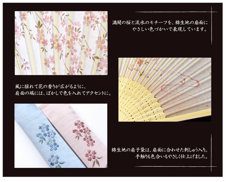 他の画像を見る 送料無料 メール便対応 満開の桜と流水のモチーフを綿素材の扇面に優しい色使いで表現しています 扇子セット喜美 ブルー 女性 扇子 京都 さんび ¥ 4,180 税込 詳細を見る お気に入りに登録する (0)