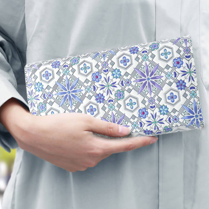 蓋の部分と本体部分の柄がつながるように仕立てています。