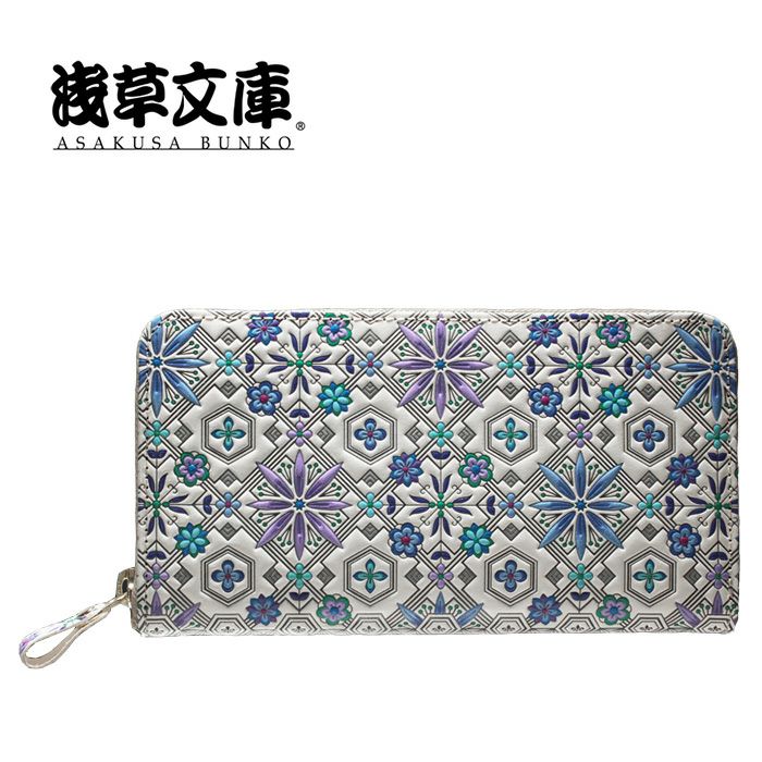 白革に重ねる彩色の芸術品 ギフトにもオススメです ラウンド長財布 花菱柄 【ブルー】 財布 革 長財布 サイフ ラウンドファスナー 女性用 浅草文庫