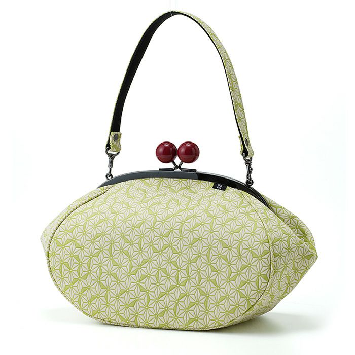 【ふくれえ織がま口】大きな赤玉がおしゃれな手持ちのがま口バッグ 麻の葉柄 赤玉バッグ《 白×緑 》/ がまぐちハンドバッグ 日本製 京都 さんび