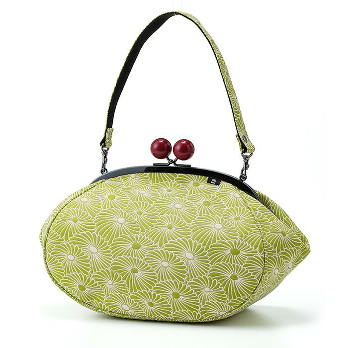 【ふくれえ織がま口】大きな赤玉がおしゃれな手持ちのがま口バッグ 菊柄 赤玉バッグ《 緑 》/ がまぐちハンドバッグ 日本製 京都 さんび