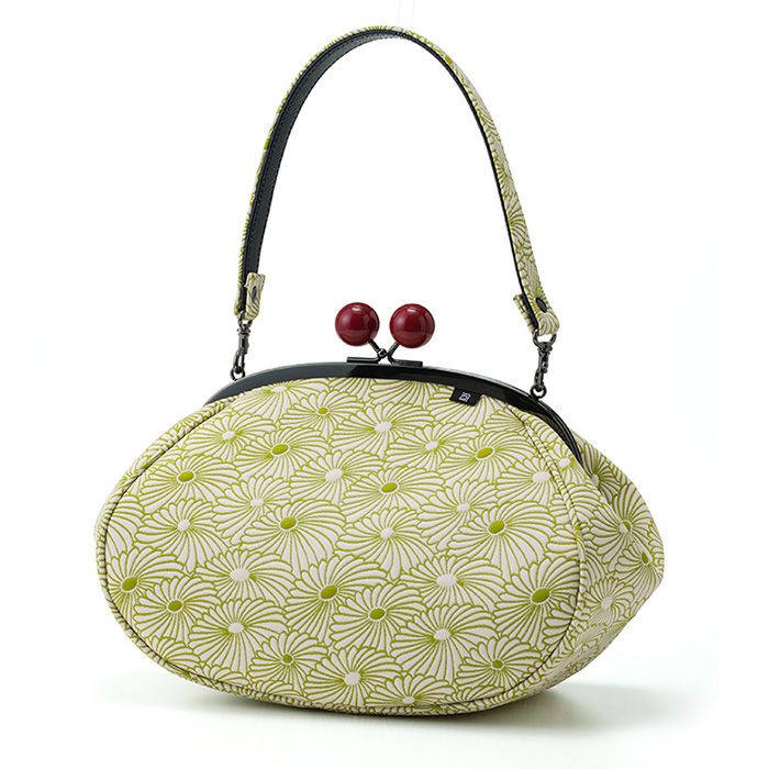 【ふくれえ織がま口】大きな赤玉がおしゃれな手持ちのがま口バッグ 菊柄 赤玉バッグ《 白×緑 》/ がまぐちハンドバッグ 日本製 京都 さんび