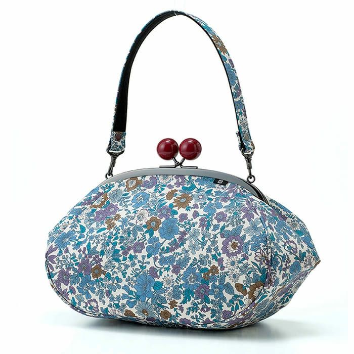 【リバティプリントがま口】大きな赤玉がおしゃれな手持ちのがま口バッグ エミリー柄 赤玉バッグ《 青》/ がまぐちハンドバッグ 日本製 京都 さんび