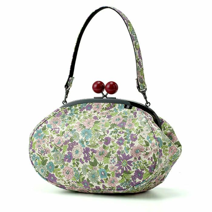 【リバティプリントがま口】大きな赤玉がおしゃれな手持ちのがま口バッグ エミリー柄 赤玉バッグ《 紫 》/ がまぐちハンドバッグ 日本製 京都 さんび