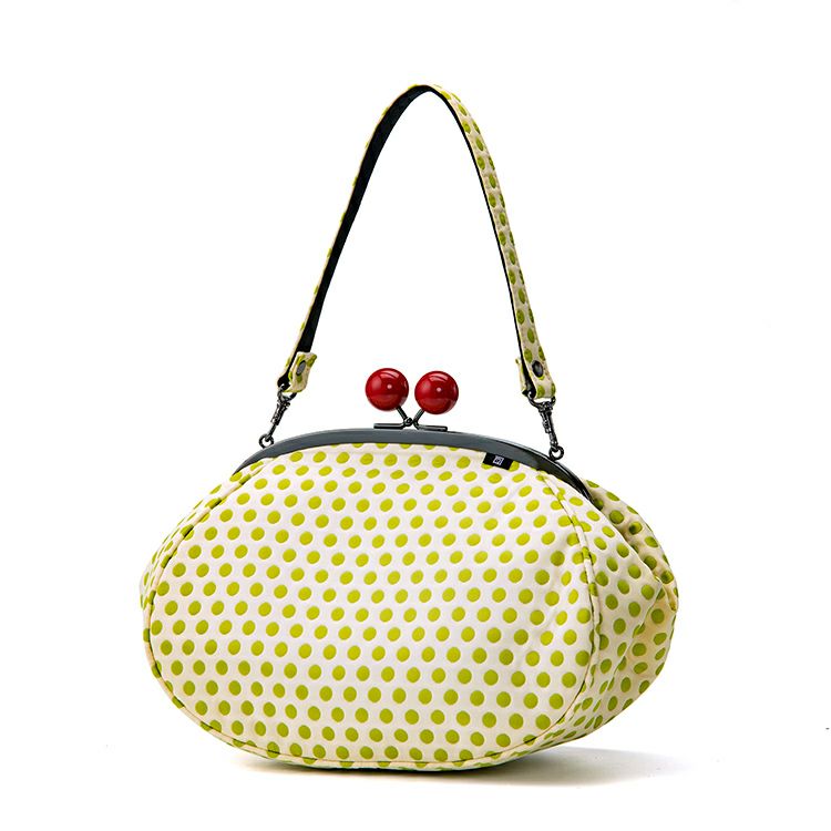 【ふくれえ織がま口】大きな赤玉がおしゃれな手持ちのがま口バッグ 水玉柄 赤玉バッグ《 白×緑 》/ がまぐちハンドバッグ 日本製 京都 さんび