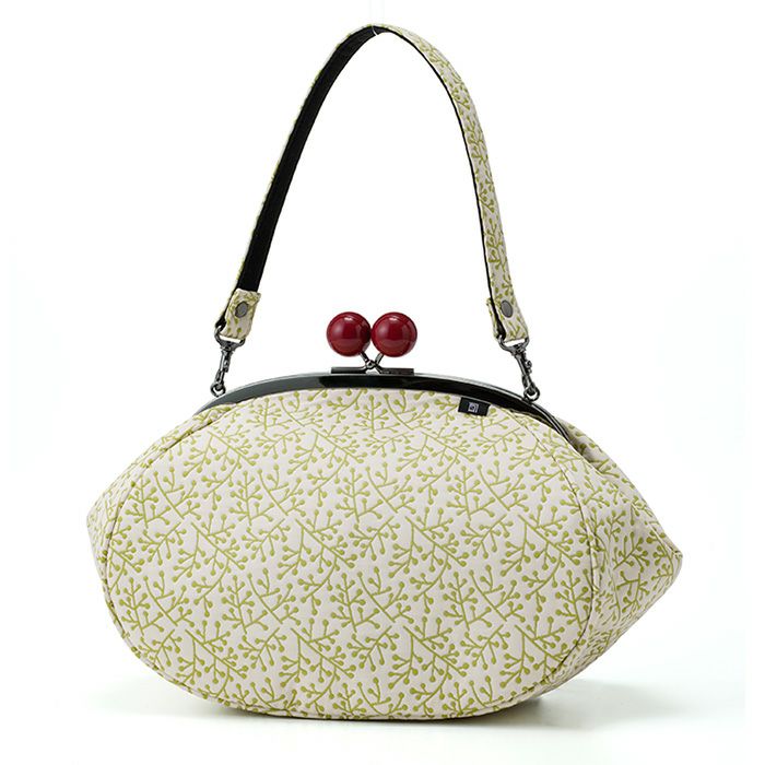 【ふくれえ織がま口】大きな赤玉がおしゃれな手持ちのがま口バッグ 南天柄 赤玉バッグ《 白×緑 》/ がまぐちハンドバッグ 日本製 京都 さんび