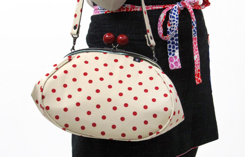 大きな赤玉がオシャレな、手持ちのがま口バッグ。