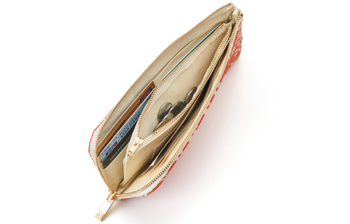 たくさん入れてもスッキリ 中央の仕切りはコインをたくさん入れても、出し入れはとても簡単、ファスナーもついていますので閉じれば中で飛び出すこともありません。中央仕切りのサイドにはレシートポケットも装備しています。左右両側には、カード入れが12個、少し大きめの診察券などが入るポケットが2個ついており、自由に収納可能です。無駄な部分がないのでたくさん入れてもスッキリとし、バッグの中でも嵩張らず、きれいに収納できます。