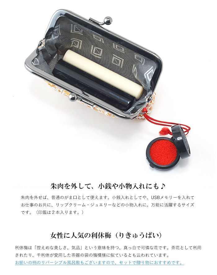 他の画像を見る メール便対応 【ふくれ織りがま口】取り外しの出来る朱肉付きでプチギフトにお薦め 利休梅柄 朱肉付き印鑑ケース《 白×赤 》/ がまぐち はんこ 日本製 京都 さんび ¥ 1,320 税込 詳細を見る お気に入りに登録する (0)