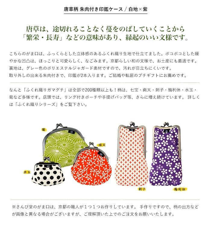 【ふくれ織りがま口】取り外しの出来る朱肉付きでプチギフトにお薦め 唐草柄 朱肉付き印鑑ケース《 白×紫 》/ がまぐち はんこ 日本製 京都 さんび