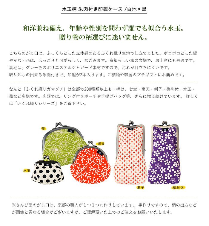 他の画像を見る メール便対応 【ふくれ織りがま口】取り外しの出来る朱肉付きでプチギフトにお薦め 水玉柄 朱肉付き印鑑ケース《白× 緑 》/ がまぐち はんこ 日本製 京都 さんび ¥ 1,320 税込 詳細を見る お気に入りに登録する (0)