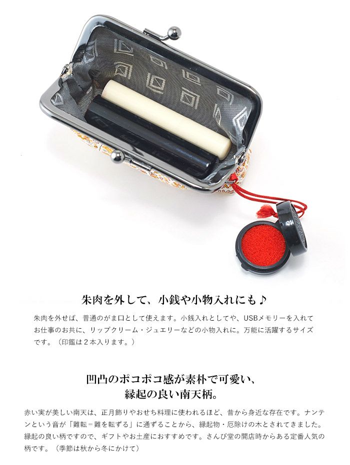 他の画像を見る メール便対応 【ふくれ織りがま口】取り外しの出来る朱肉付きでプチギフトにお薦め 南天柄 朱肉付き印鑑ケース《 赤 》/ がまぐち はんこ 日本製 京都 さんび ¥ 1,320 税込 詳細を見る お気に入りに登録する (0)