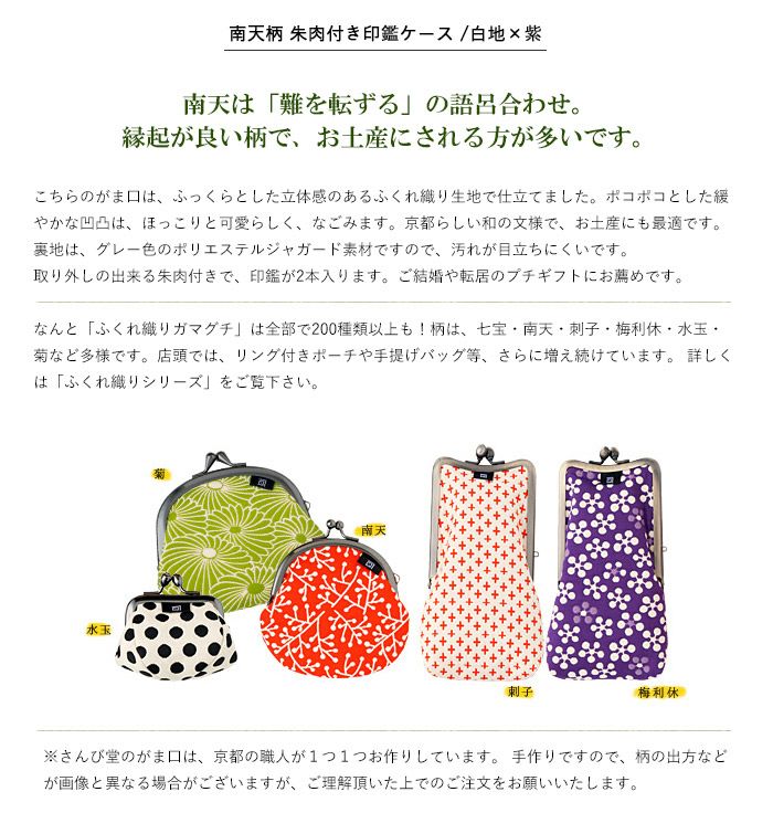 【ふくれ織りがま口】取り外しの出来る朱肉付きでプチギフトにお薦め 南天柄 朱肉付き印鑑ケース《 白×紫 》/ がまぐち はんこ 日本製 京都 さんび