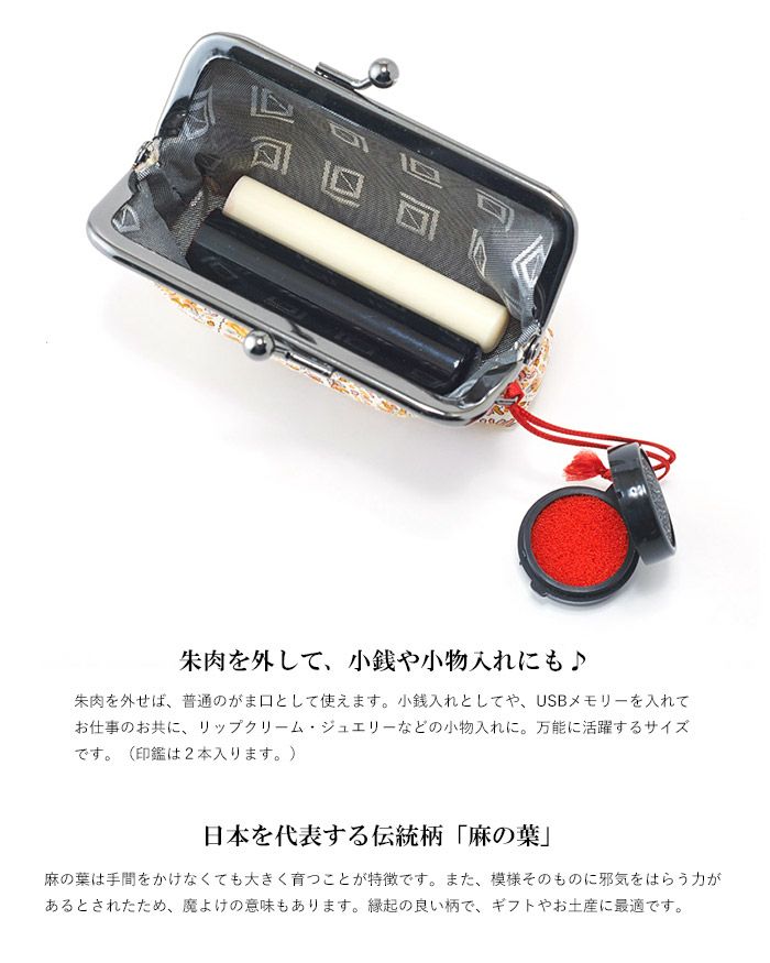 他の画像を見る メール便対応 【ふくれ織りがま口】取り外しの出来る朱肉付きでプチギフトにお薦め 麻の葉柄 朱肉付き印鑑ケース《 白×黒 》/ がまぐち はんこ 日本製 京都 さんび ¥ 1,320 税込 在庫切れ 詳細を見る お気に入りに登録する (0)