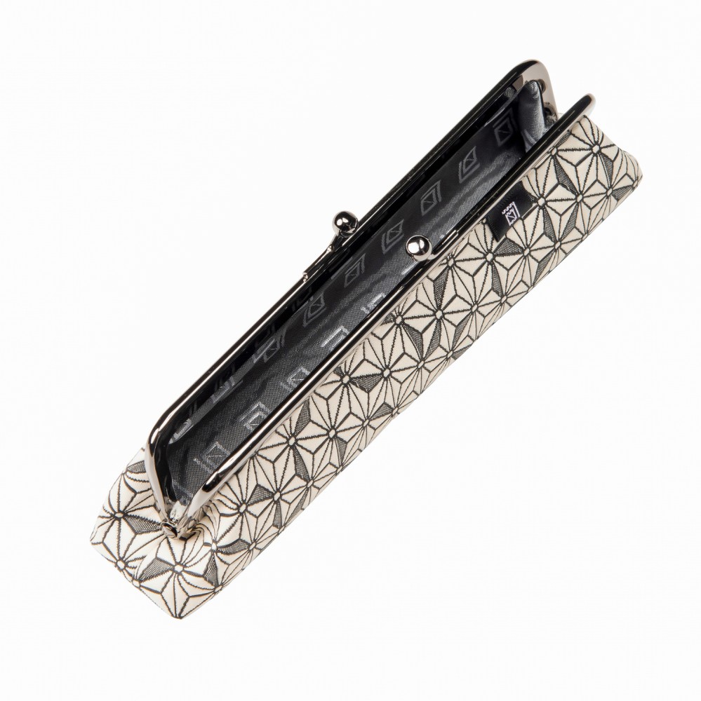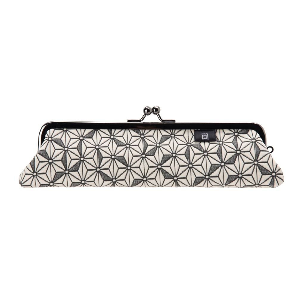 こちらのがま口は、ふっくらとした立体感のあるふくれ織り生地で仕立てました。ポコポコとした緩やかな凹凸は、ほっこりと可愛らしく、なごみます。京都らしい和の文様で、お土産にも最適です。裏地は、グレー色のポリエステルジャガード素材ですので、汚れが目立ちにくいです。