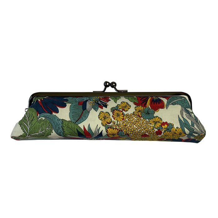 こちらのがま口は、リバティプリントのタナローン生地で仕立てました。タナローンは、シルクの艶となめらかさを目指して作った上質な綿ローンです。コットンのナチュラルさを残しつつ、しなやかな微光沢がカジュアルすぎない上品な雰囲気を醸し出しています。裏地は、グレー色のポリエステルジャガード素材ですので、汚れが目立ちにくいです。