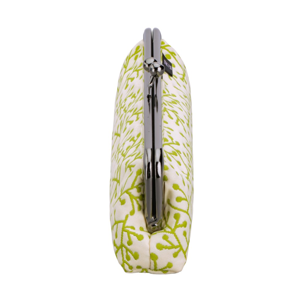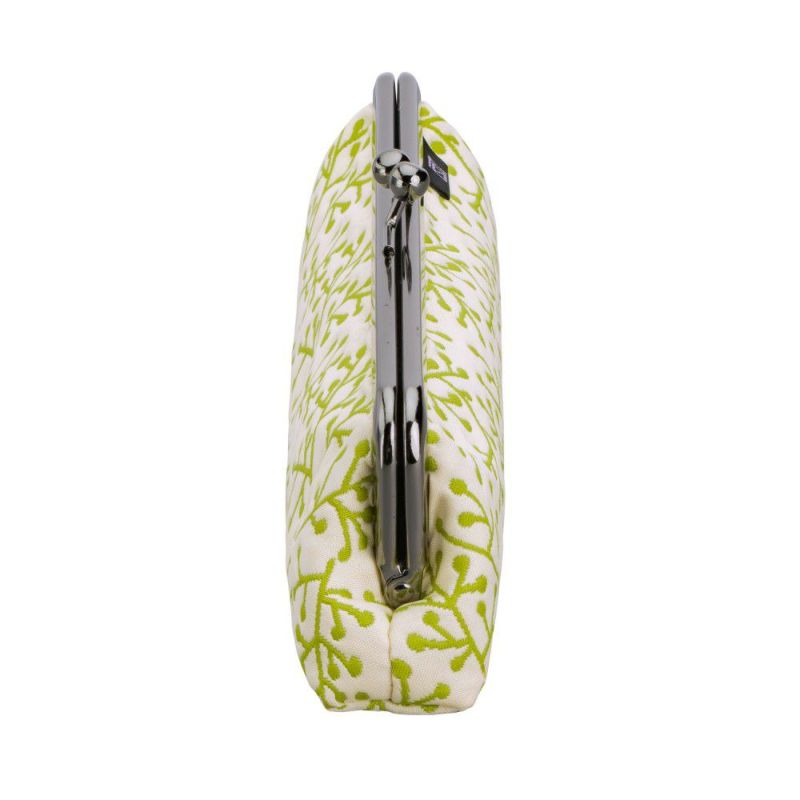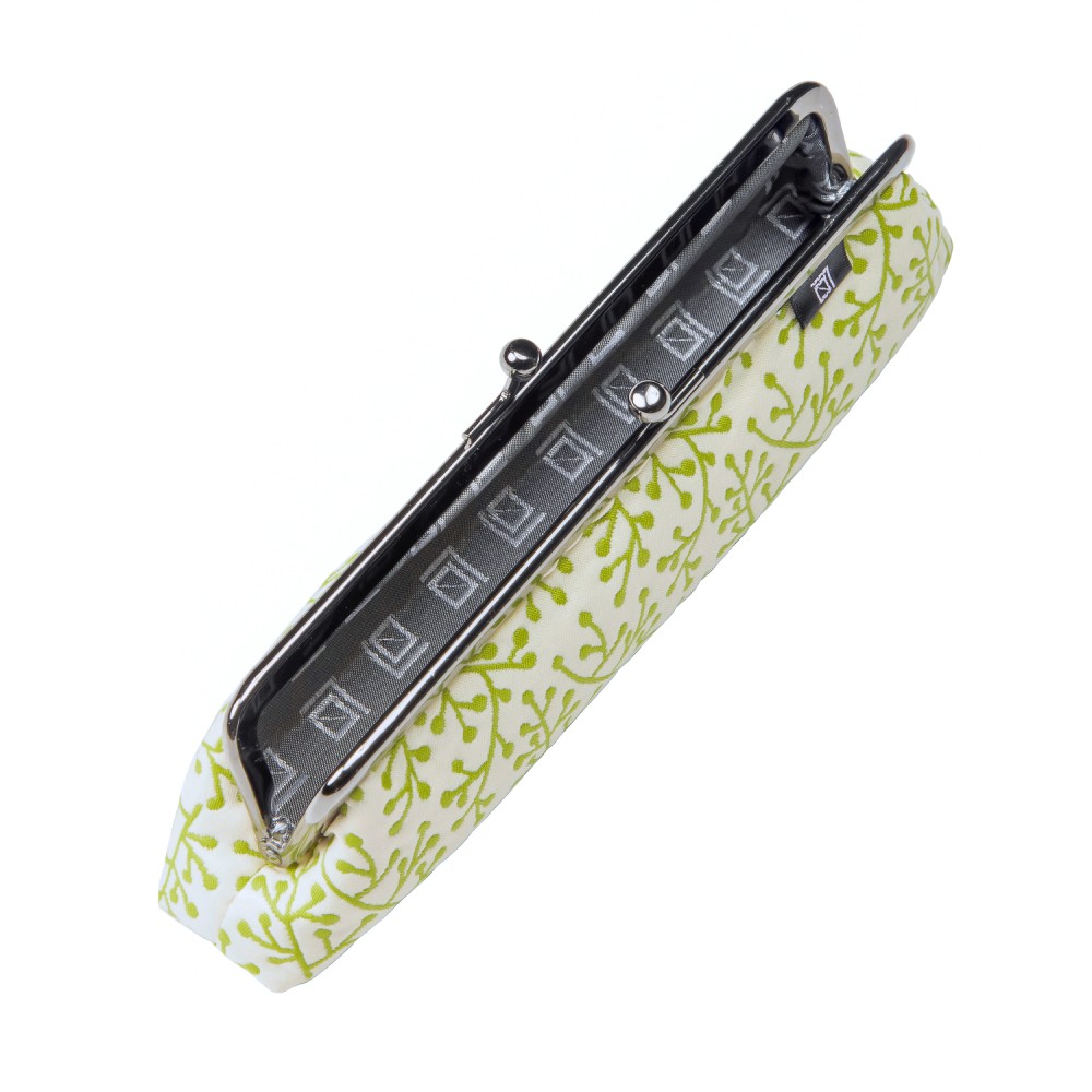こちらのがま口は、ふっくらとした立体感のあるふくれ織り生地で仕立てました。ポコポコとした緩やかな凹凸は、ほっこりと可愛らしく、なごみます。京都らしい和の文様で、お土産にも最適です。裏地は、グレー色のポリエステルジャガード素材ですので、汚れが目立ちにくいです。